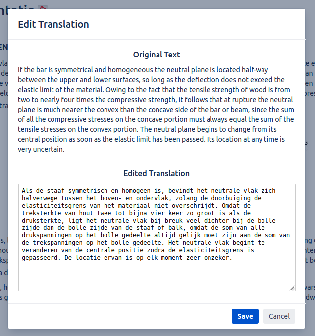 Once you've completed your edit, click save and the new version of the translation will be automatically saved, and the page updated. Whenever this page is translated to the same target language again, your edited version will be displayed in place of the machine translated one. Edited translations are never overwritten by machine generated ones.
