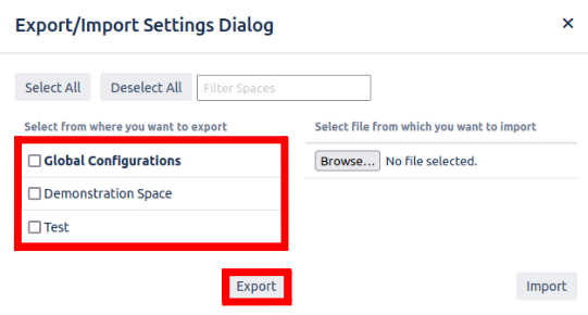 One can export Easy Dropdown Menu settings as a JSON file in order to import them again in another Server/DC/Cloud instance or use it as a backup. First check all spaces whose settings you want to export. You can search a space by writing the Space name in the search. One can export the global configuration and the configuration for each space. Then click on export and select where you want to save the JSON file.