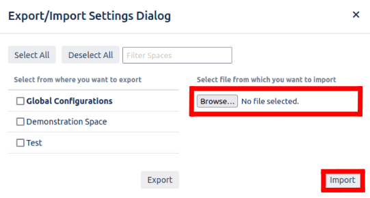 You can import settings from a JSON file. First click on browse and the JSON file that contains exported EDM settings. Then click on import. With that your settings get imported into your confluence instance.