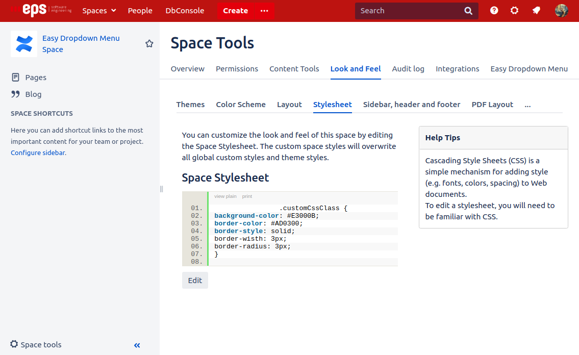 Click on the Edit button to modify the stylesheet. Now you can create your own CSS class. After defining your CSS class press the Save button to save your changes.