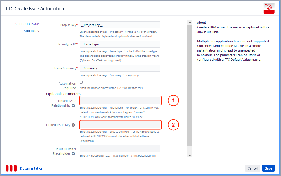 In the Replace Placeholder dialog, once you have selected a project and an issue type, all fields related to the PTC Create Issue Automation macro and your selection will appear.