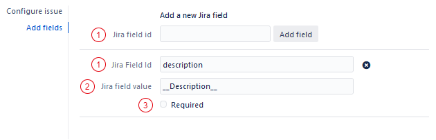 (1) Jira Field id | Enter a valid Jira field id(see Get Jira Field ID) Note: The Jira field id is not the same as the Jira field name! (e.g. the Jira Field “Description” has field id “description”, custom fields usually have an id like “customfield_10101”) |